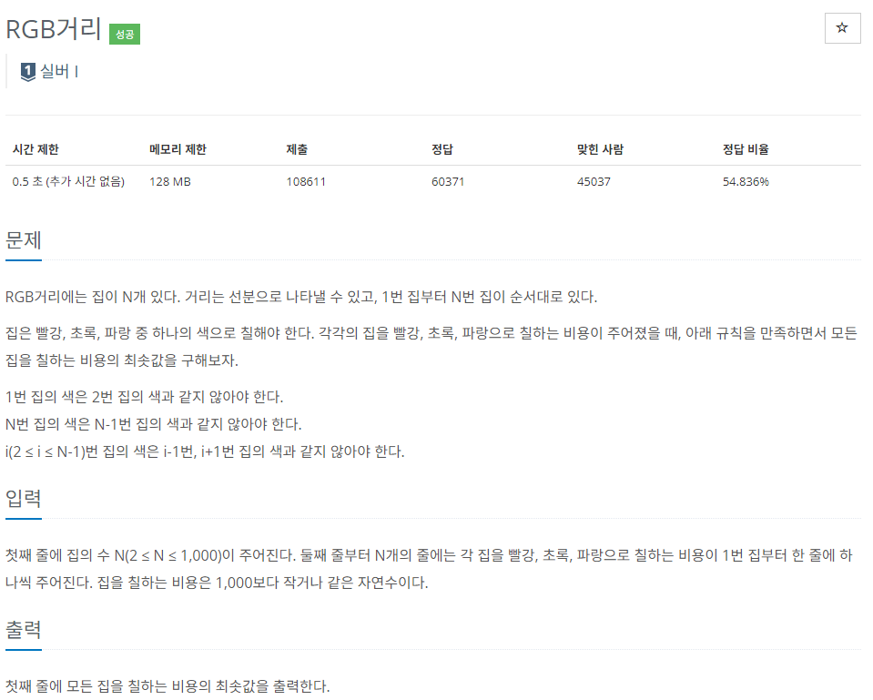 - 동적 계획법을 통해 빨강, 초록, 파랑으로 칠하는 경우 중 비용이 가장 작은 경우만 저장하는 배열을 통해 해결