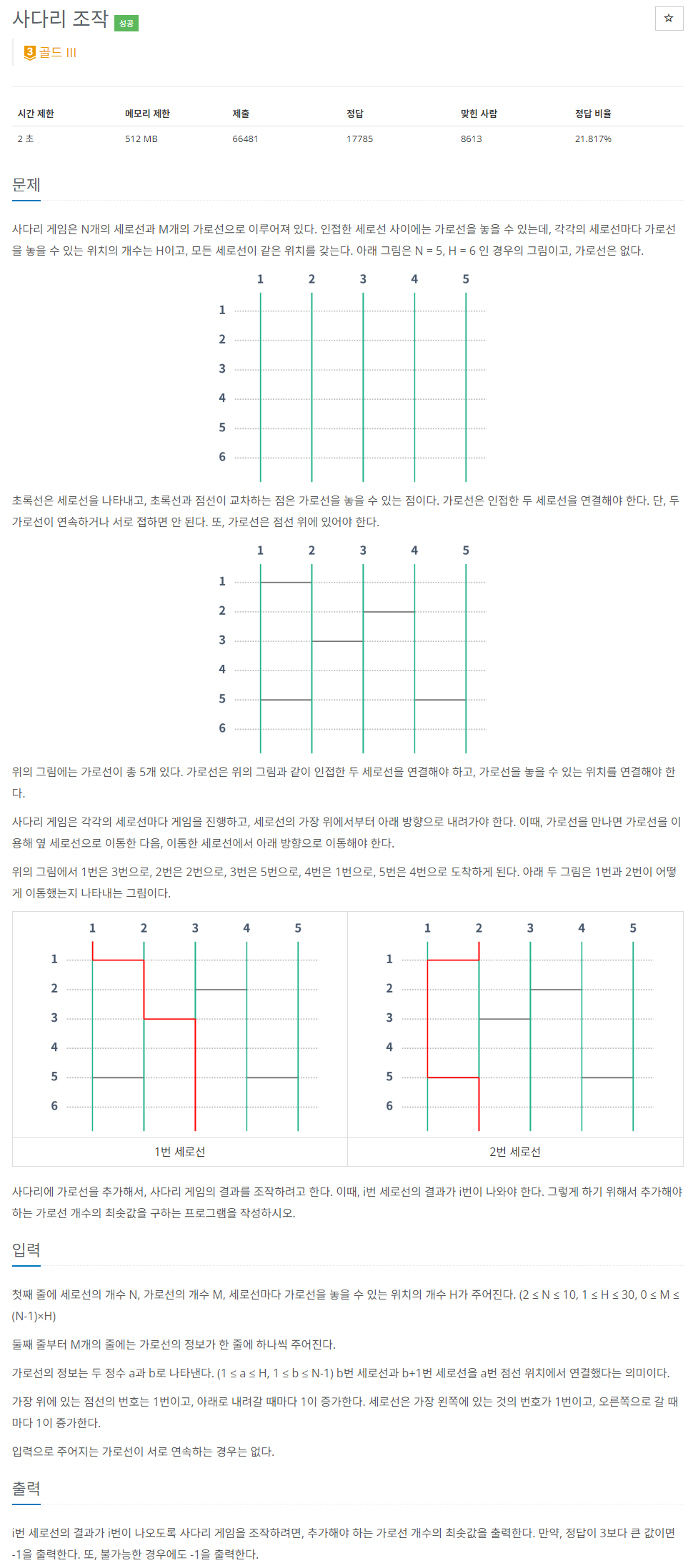 - 사다리를 모두 놓아보면서 판별해야하는 문제