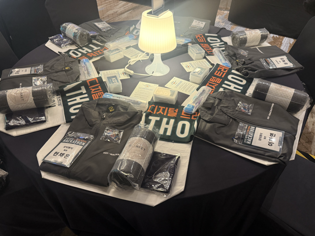 (왼) 해커톤 식장 입장 시 (오) 웰컴키트가 올라가있는 팀 테이블