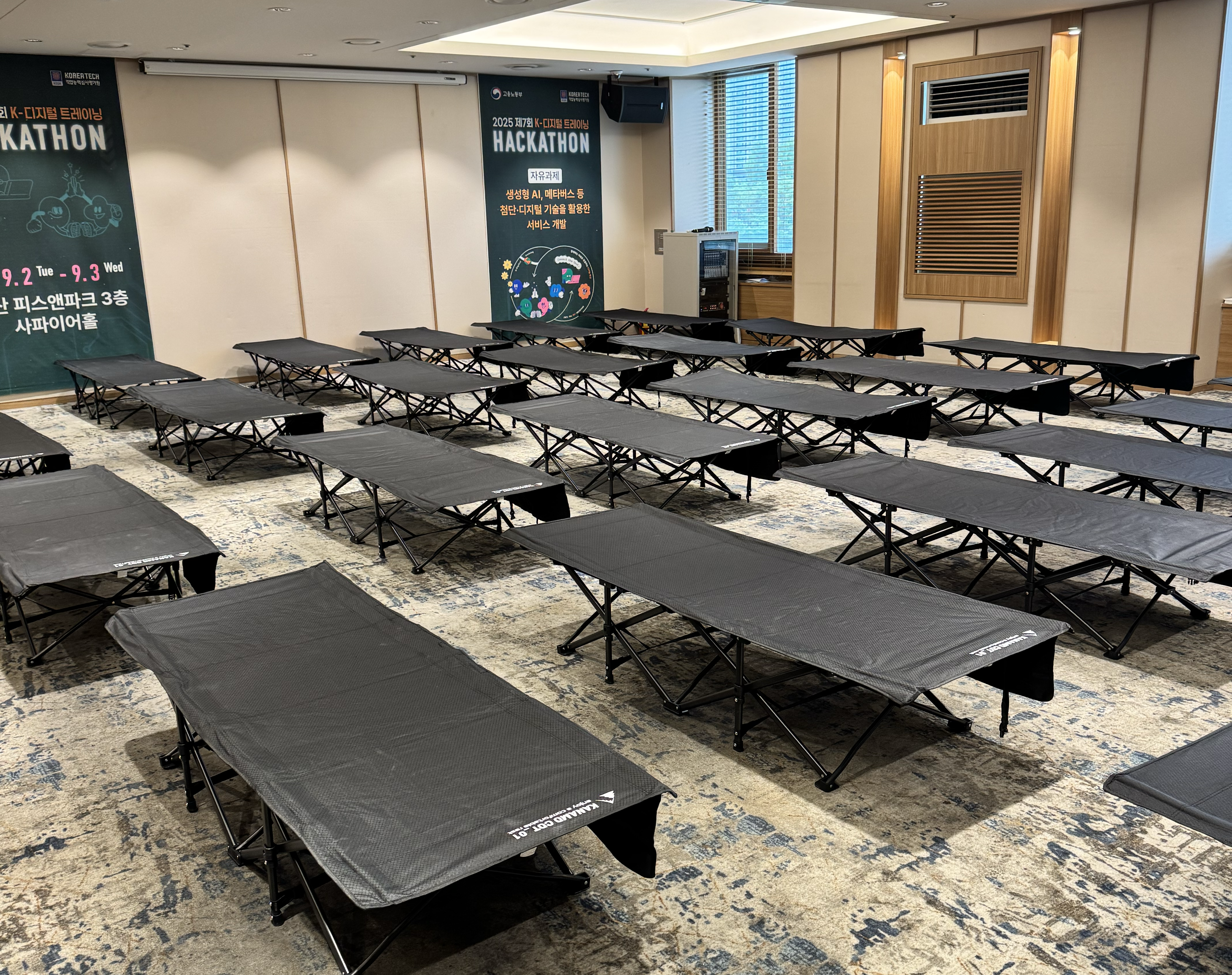 휴식 공간 수면실 제공(남여 구분) 이전 해커톤에서는 샤워실 같은 것도 있다고 들었는데 이번 회차부터 그런건지 저희는 수면실만 있었습니다.